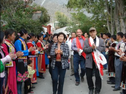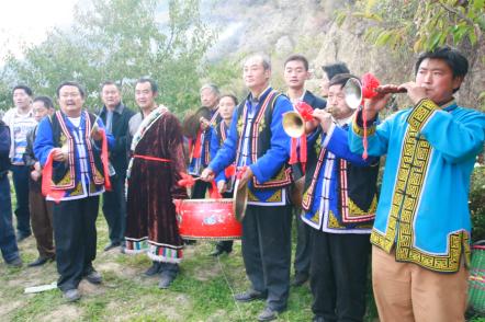 敲锣打鼓为解决当地村民人畜饮水困难,沿海地产与中国妇女发展基金会协商,将沿海集团“健康住宅·母亲水窖”捐建工程的首站选在阿坝州茂县。2007年10月25日,在沿海地产副总裁成实的率领下,参加沿海地产“健康住宅·母亲水窖”首窖开挖仪式的代表抵达茂县甘青村。就是这样一个沿海人视为自身责任的平常举动,却受到当地村民高度重视,以他们的最高礼仪来表达这一份感激之情。
