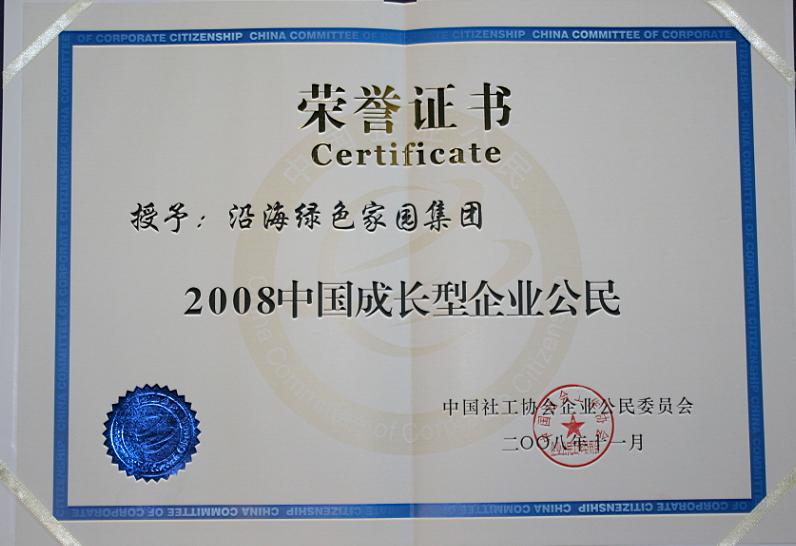 11月16日,由中国社工协会企业公民委员会主办的第四届中国优秀企业公民表彰大会,在北京人民大会堂隆重举行。沿海集团因其良好的企业经营业绩、高度的社会责任感以及在母亲水窖、抗震救灾中的突出表现,被授予“2008中国成长型企业公民”称号。这是继6月底沿海集团获得中国地产金砖奖之最高奖项------“中国地产企业公民大奖”后,又一次在企业公民领域得到权威的认可。