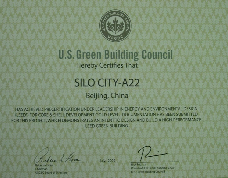 沿海集团于2005年注册成为美国绿色建筑委员会的会员单位,并申报LEED认证体系,北京赛洛城整体申报LEED-ND社区认证示范项目、四期A-22号楼申报LEED-CS单体金级认证。单体认证分为预认证(设计阶段)、认证(施工阶段)两阶段。预认证代表美国绿色建筑委员会批准我方在A-22号楼所做的设计及计划采取的各项措施满足LEED-CS金级的标准。据悉,中国目前仅有4个项目正式获得LEED-CS金级认证。