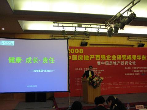 中国国际贸易促进委员会建设行业分会会长(原建设部国际合作司司长)龚沪生先生为此次华东发布会致开幕辞,高度评价2008中国房地产百强企业研究的意义。中国房地产TOP10研究组办公室主任兼中国指数研究院常务副院长黄瑜女士发布“ 2008中国房地产百强企业 ”研究报告,沿海集团荣膺“2008中国房地产百强企业”。