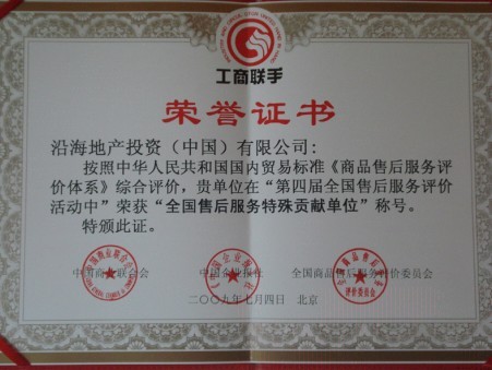 沿海集团一直致力于提升服务水平 ,一贯将客户服务置于十分重要的地位 ,顾客责任已经成为集团责任体系的重要组成部分。去年,沿海集团创新推出400客服系统,开创全国房地产行业优质服务之先河。组委会专家一直认定,沿海集团客服体系有着先进的服务理念、稳定的技术平台、高超的服务效率,运行一年以来不仅取得了良好的服务效益,而且促进了房地产行业服务理念和服务水平的提升。此次荣获全国售后服务突出贡献单位,实至名归。