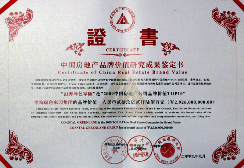 沿海集团以持之以恒的品牌建设和责任领跑的持续创新,荣获2009年度中国房地产品牌价值TOP10。这是沿海集团连续六年获此殊荣。